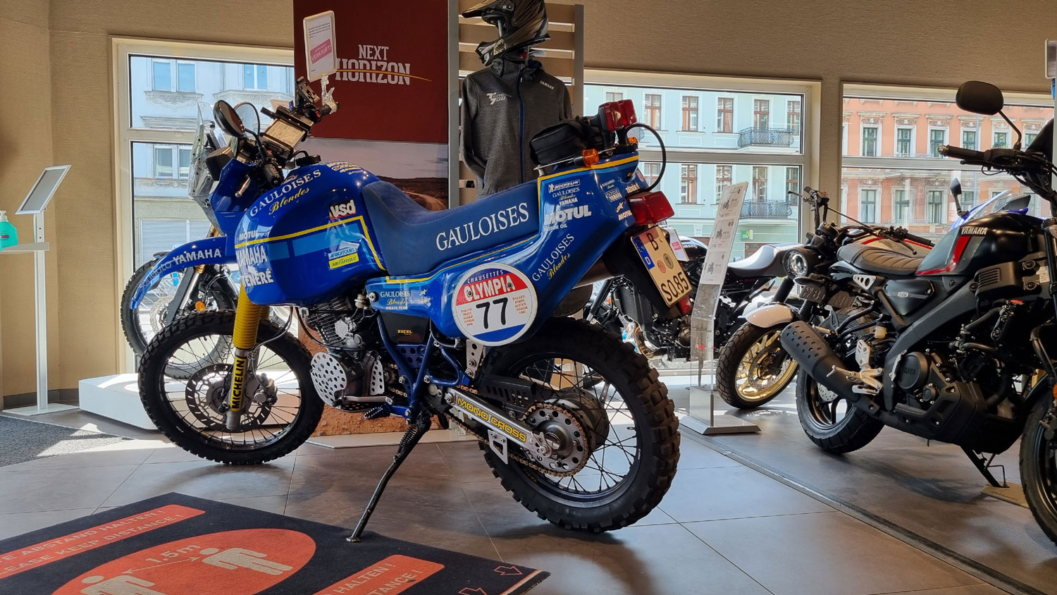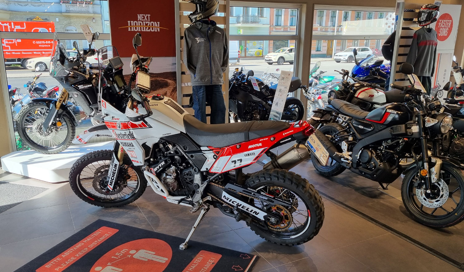 So sah das 2022 aus beim YAMAHA ZENTRUM BERLIN : Meine Mopeds begrüssten schon am Eingang die Kunden, die das natürlich toll fanden Das waren tolle Anblicke, nur Einen störte das - Ilja Boshammer den Verkaufsleiter Wie viele Kunden mich daraufhin ansprachen... ... bessere Werbung für die T7 kann man einfach nicht machen