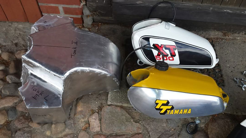 Der Plan war jedoch mal ein anderer, denn bevor Nils das Glück hatte, den Originaltank von Gilles Comte zu ergattern, hatte er bereits akribisch daran gearbeitet den ersten SONAUTO Tank der XT 500 von 1979 detailgetreu nachzubauen. Zeichnungen wurden gemacht, Pappschablonen hergestellt und schließlich wurden mit unglaublichen Aufwand und Unmengen an Arbeitsstunden, tatsächlich zwei Repliken der legendären Paris - Dakar Tanks hergestellt. Wahre Meisterwerke sind so entstanden, man kann sich kaum vorstellen, wieviel Zeit, Arbeit, Geld und Liebe in diesen beiden Tanks geflossen sind - unglaublich. Was für eine tolle Arbeit.