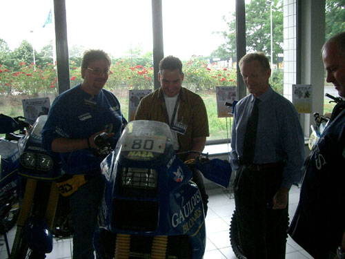 Man brauchte ihn gar nichts zu fragen, es war, als ob die ganzen, von ihm erlebten Storys, aus seinem Mund raussprudelten, als ob er endlich mal wieder Jemanden davon erzählen konnte, der auch noch wußte, wovon er sprach, denn die meisten seiner alten Mitstreiter und auch die Monteure von damals waren nicht mehr da - so erzählte er. MiGa übersezte, denn ich war viel zu aufgeregt, nun auch noch konzentriertes Englisch zu sprechen. Wie gesagt, er war unglaublich nett und freundlich, lud uns zum Essen ein, beschenkte uns und liess es sich nicht nehmen uns persönlich seine "Schätzchen" zu zeigen, dabei erzählte er so tolle Dakar Geschichten... einfach toll. Auch einen Blick in seine Edelschmiede ermöglichte er uns, wo die damals aktuellen WR 450 Allrad Dakar Modelle gerade gebaut wurden. Obwohl oben in der ersten Etage ein ganzer Konferenzraum auf ihn wartete nahm er sich trotzdem enorm viel Zeit für uns. Zurück